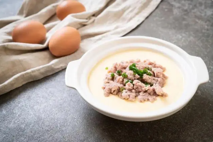做法:豬肝或瘦肉切片,放入開水中焯熟,撈出剁成末;碗中打入雞蛋液,加少量鹽、水,一起調(diào)勻,上鍋蒸熟后,淋少許香油,放上肉末、蔥花即成。